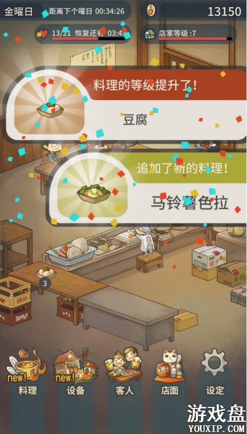 顾客吃了料理,他们的满意度会相应上升,满意度上升后还会引发对话。游戏中的金币主要用来购买店内设备,例如能够增加制作料理总上限的料理放置台,餐桌用来增加在店内吃饭顾客的人数上限,以及冷藏库、收银机等等提高各项属性的道具。在进入店内的每位食客都有着独特喜欢的料理,不断地吸引食客来吃饭从而增加每个食客的满足度。随着满足度的增加会触发不同食客的特殊对话剧情。