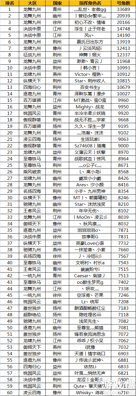 御龙大陆,乱世纷扰,故英雄豪杰辈出,他们或为一国明主,或为天下名将、贤良之臣,他们用自己无双才智守卫着自己的国家,而国战大咖秀年度指挥赛事便是给予他们展现自己风采的绝佳舞台,本季赛事共计有两百余名指挥参与首轮对决,经过甄选,60位来自全区全服的优秀指挥脱颖而出,成功入围决赛。让我们恭喜他们。【入围决赛的奖励50000金子将在7个工作日内发放,请指挥们知悉】